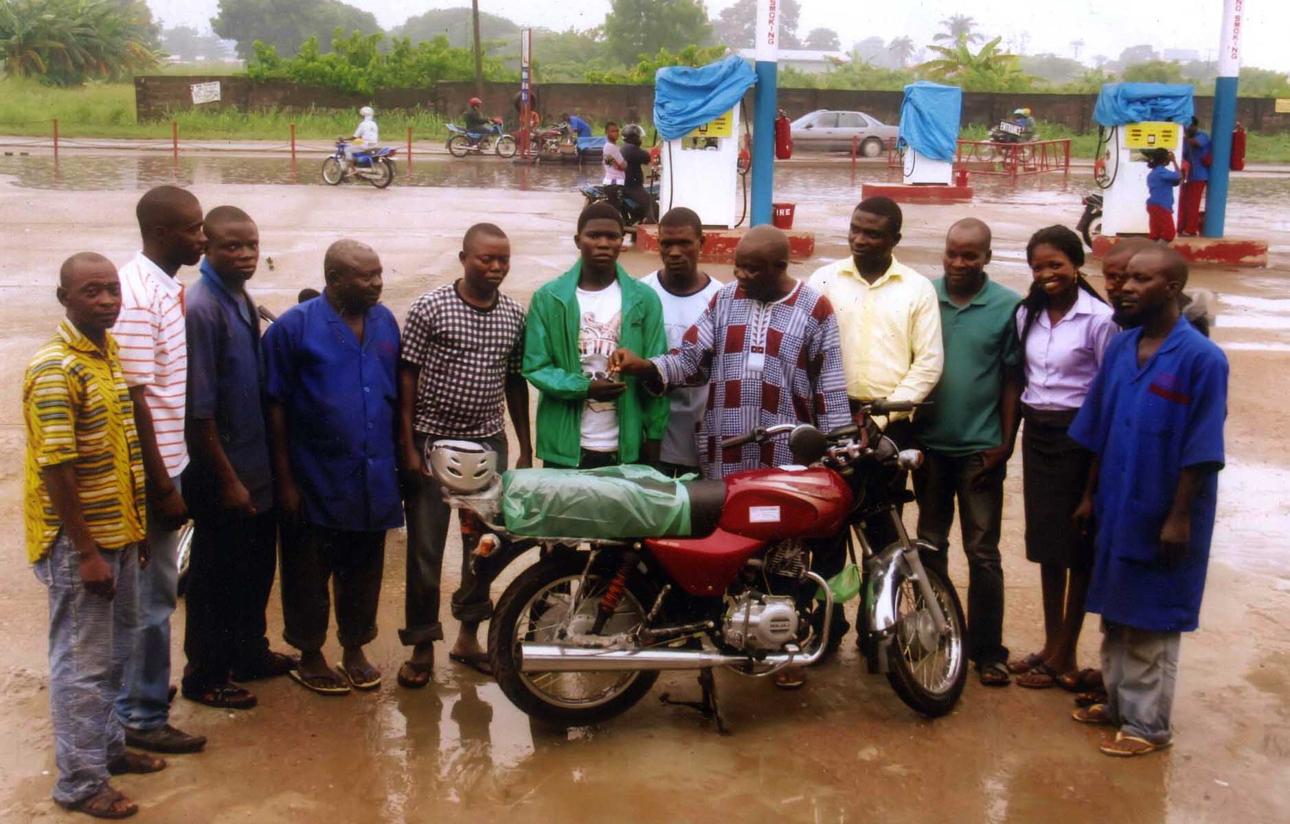 Fifth from right, The Executive Coordinator of The Cookey Franklin's Foundation (TCFF), The Chairman of Okoda Association Ojo Cantonment Barrack badagry Express Way Lagos State and the Honourable Members of the Foundation, During The presentation of Motocycle (Okoda) to Mr Jerry Jonathan as part of the foundations pledge to put smiles on the faces of less priviledge.